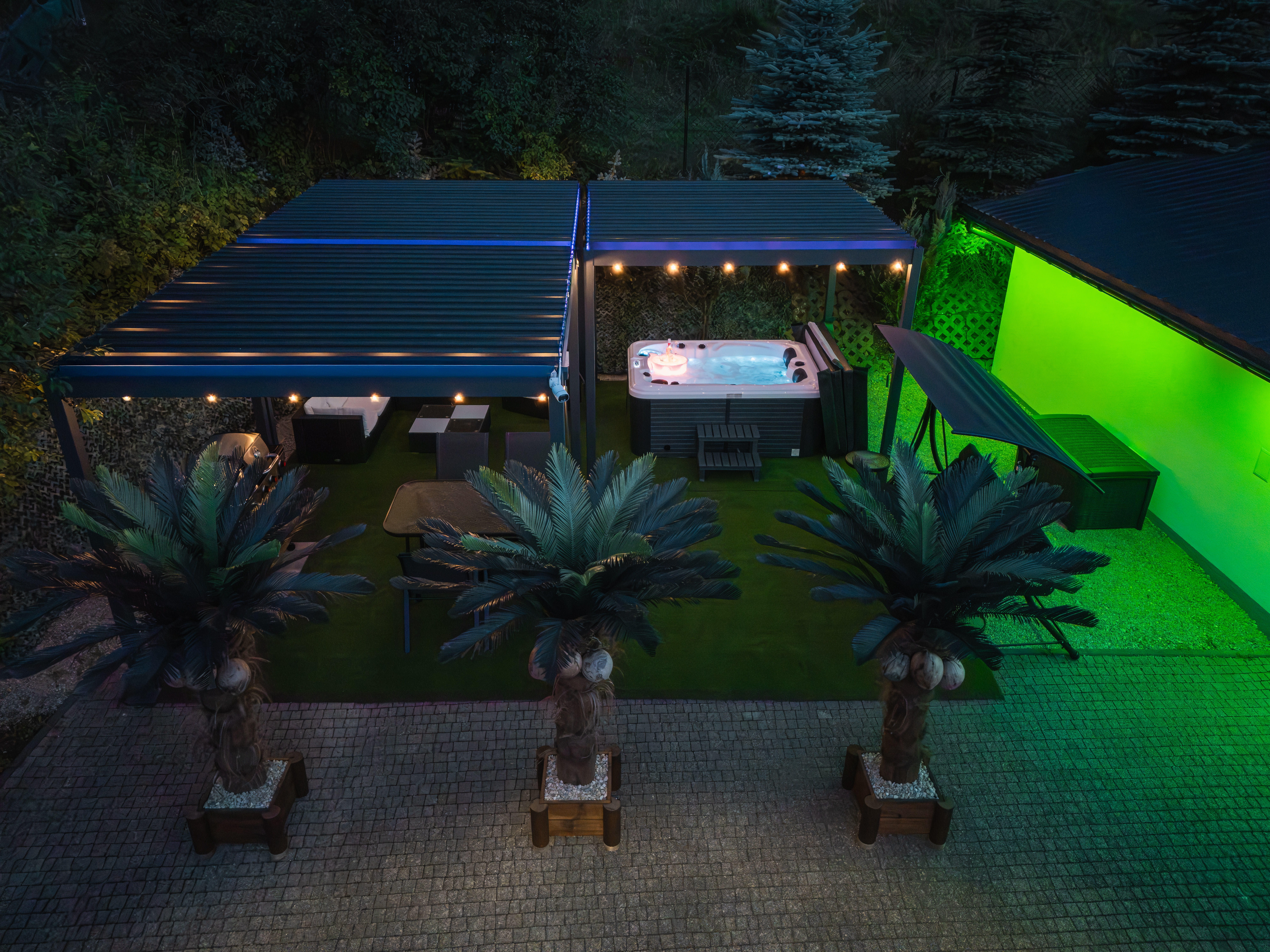 Do dyspozycji naszych gości strefa relaksu: przestronny całoroczny ogród otwarty z zadaszeniem w postaci pergoli z ruchomymi lamelami ,w którym znajdują się: jacuzzi ogrodowe, grill węglowy lub gazowy do wyboru, wypoczynkowe meble ogrodowe ,huśtawka , darmowe wifi, palenisko z ruchomym rusztem.