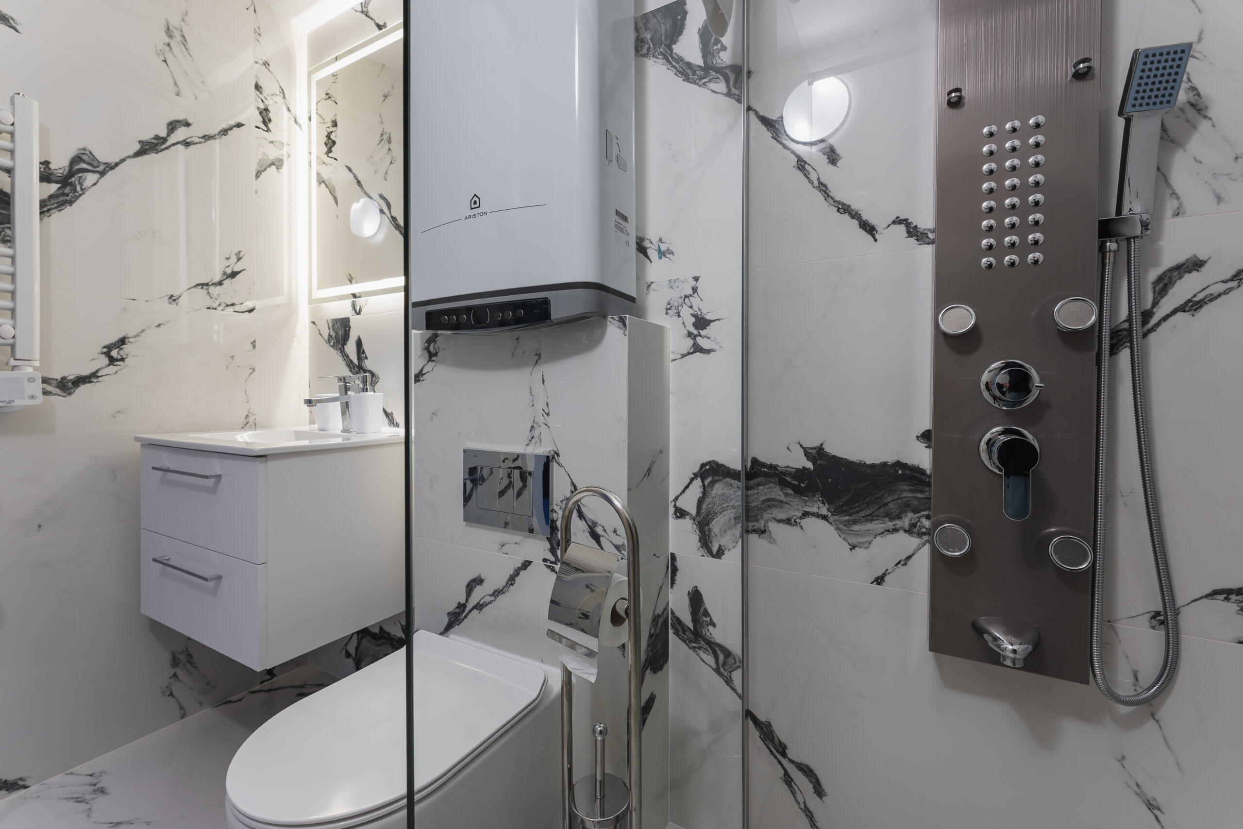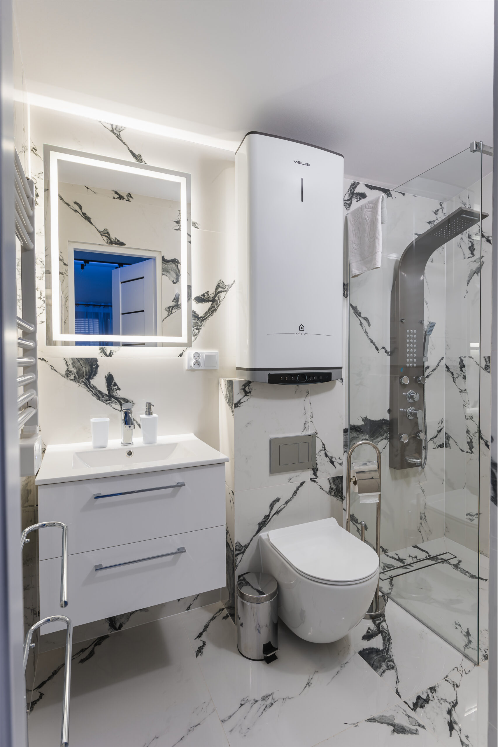Apartament posiada łazienkę z prysznicem, ręczniki, szlafroki,darmowe Wi-Fi, klimatyzację,zestaw powitalny: czajnik, kawa, herbata.