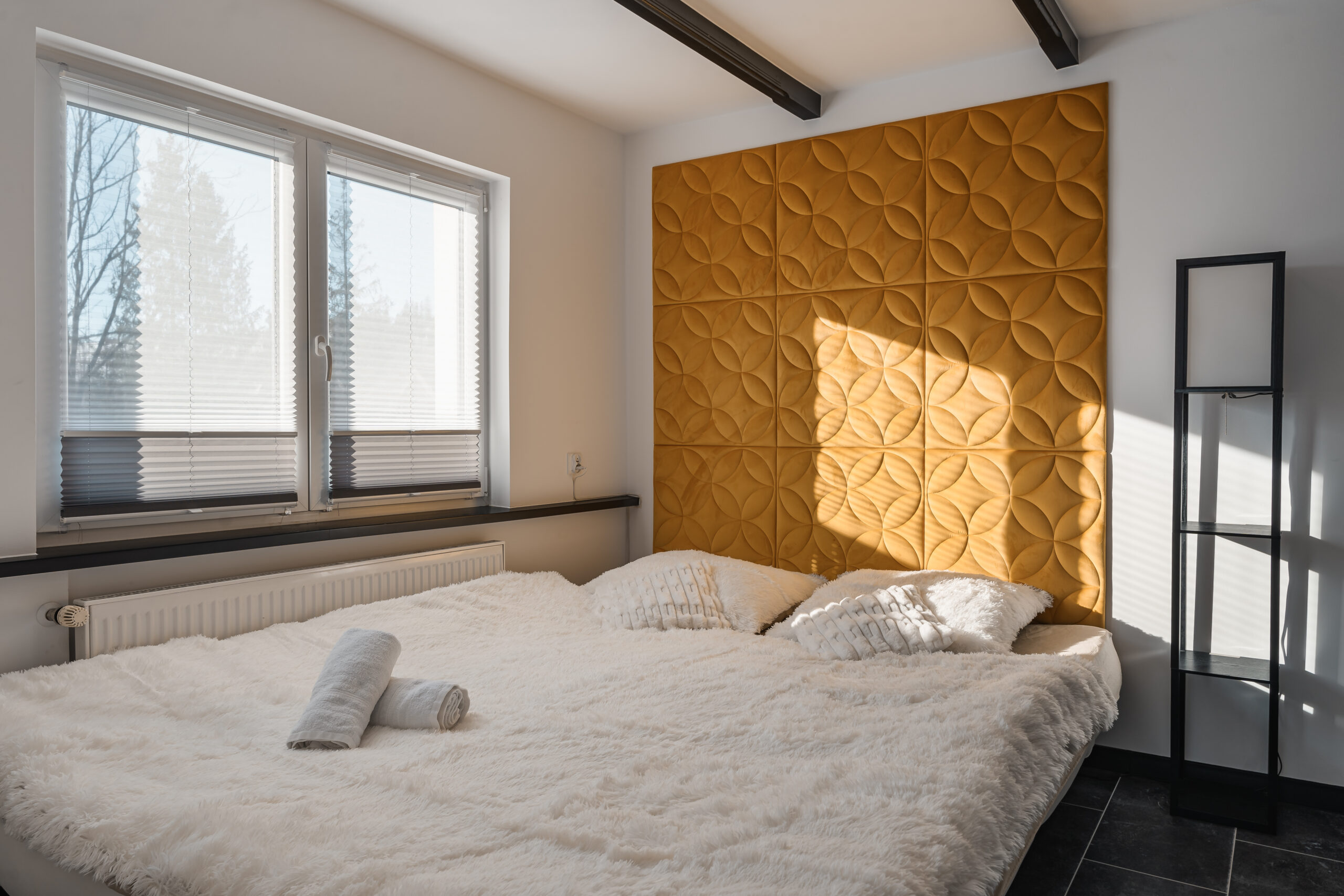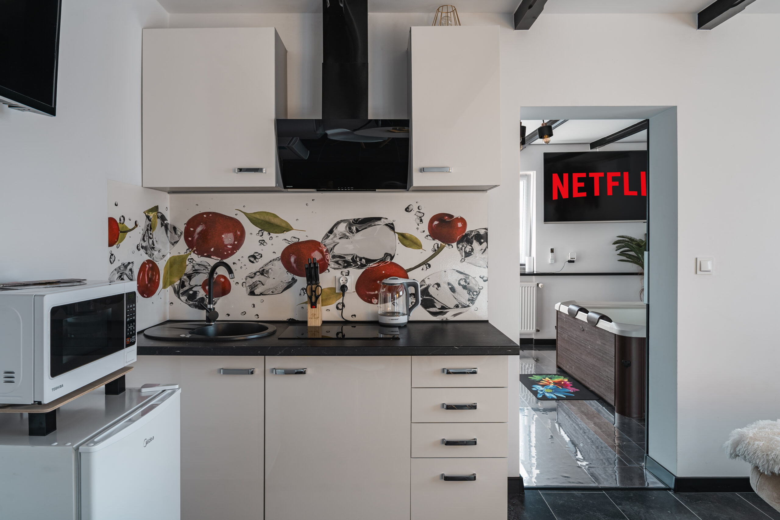 Apartament podzielony jest na kilka stref między innymi: strefa z w pełni wyposażoną kuchnią oraz jadalnia, Smart tv65″ oraz 55″ Netfix itp. a także sypialnia: dwa łóżka dwuosobowe lub jedno ogromne łóżko king size o wymiarze 240×200 cm,