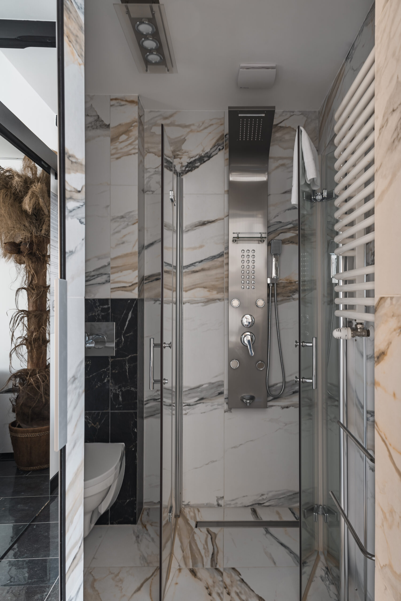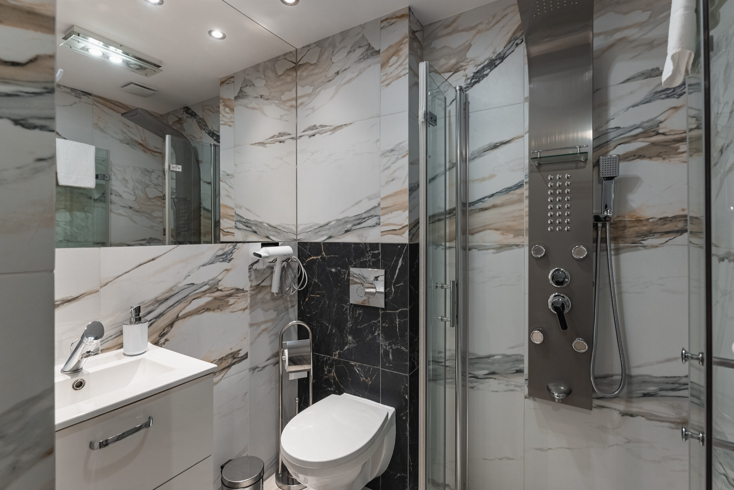 Apartament posiada łazienkę z prysznicem z funkcją masażu, ręczniki, szlafroki,darmowe Wi-Fi, klimatyzację,zestaw powitalny: czajnik, kawa, herbata.